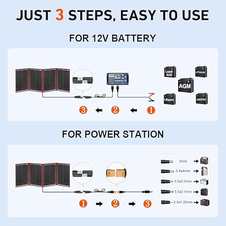 - 【ALL-IN-ONE KIT, READY TO GO】 Includes 200W foldable panel, standalone controller, SAE/XT60/alligator clips, 4 DC adapters (3.5×1.35mm / 5.5×2.1mm / 5.5×2.5mm / 8.0mm), 9.8ft cable, storage bag, and manual—everything you need for quick setup out of the box.
